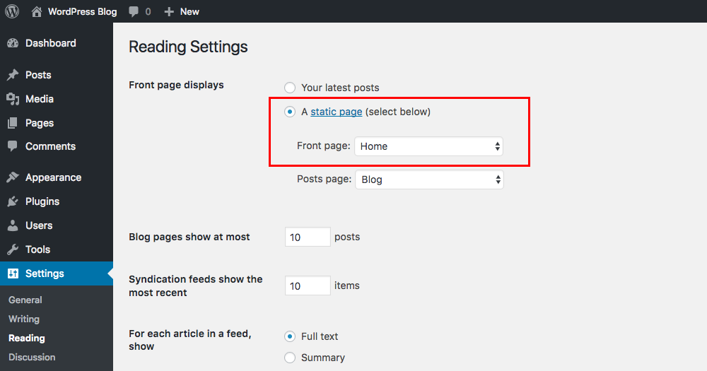 To set your homepage, go to "Settings" > "Reading." You can keep the default setting ("Your latest posts") or choose the "Static Page" option and set your homepage to the page you created, and add a posts page (if any).